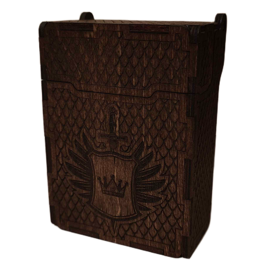 Beskyt dine kort med stil og styrke. Denne håndlavede kortboks er inspireret af klassiske våbenskjolde og rustningens skæl, og bringer en følelse af ære og eventyr til dit spilbord.